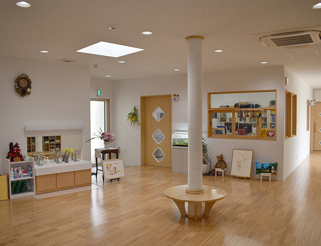 玄関ホールを中信に、各諸室を放射状に配置し、保育士の目が届きやすく、自然の光も各部屋にまんべんなく降り注ぐ暖かで明るい環境となっております。